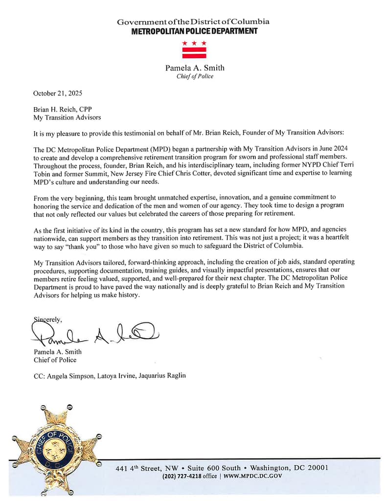 At My Transition Advisors, we offer a full range of services to help all levels of law enforcement & other public sector professionals transition to private-sector careers & opportunities. We help you form a plan to make the jump to fully understand the options of how to prepare for the next chapter in your career.